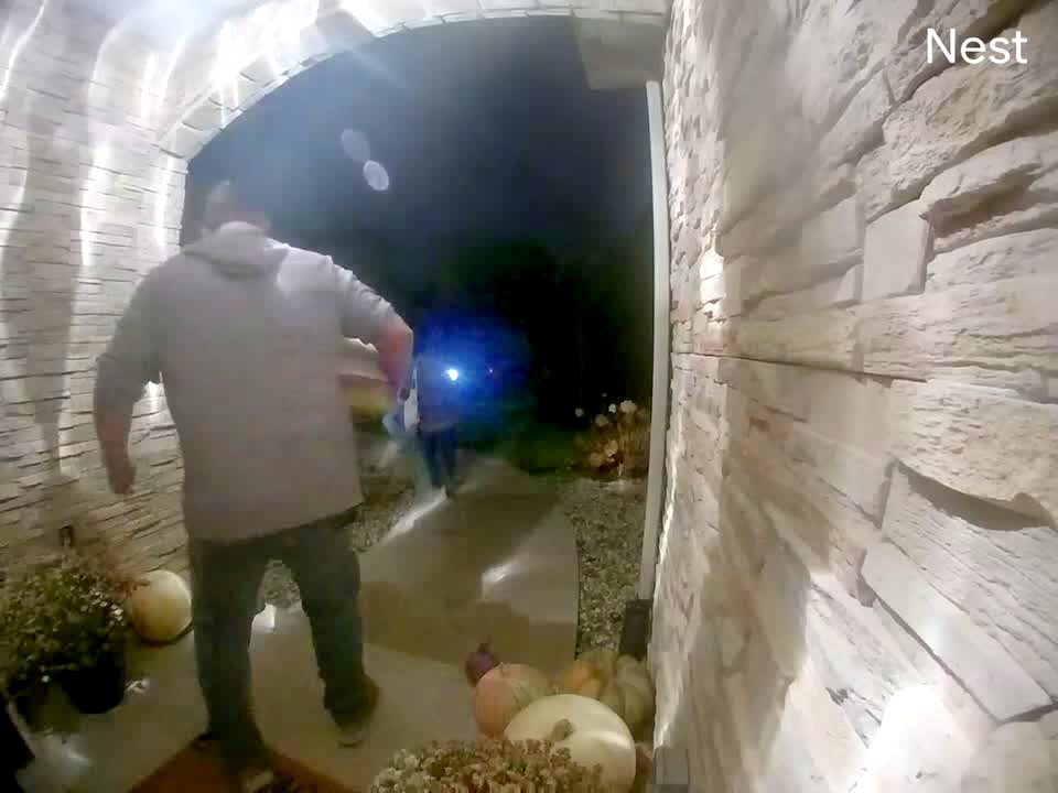 Security footage of a man who falls down the porch steps and says Ow at the end.