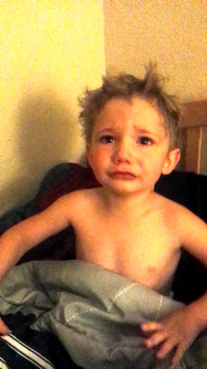 A man and woman sing Happy Birthday to a tot boy and the boy frowns and cries at the end.