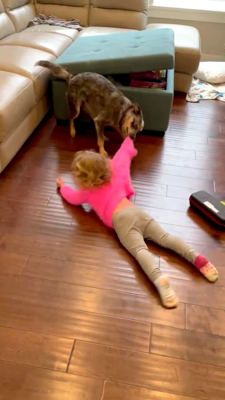A dog pulls a young girl's shirt in his mouth and drags her across the living room.