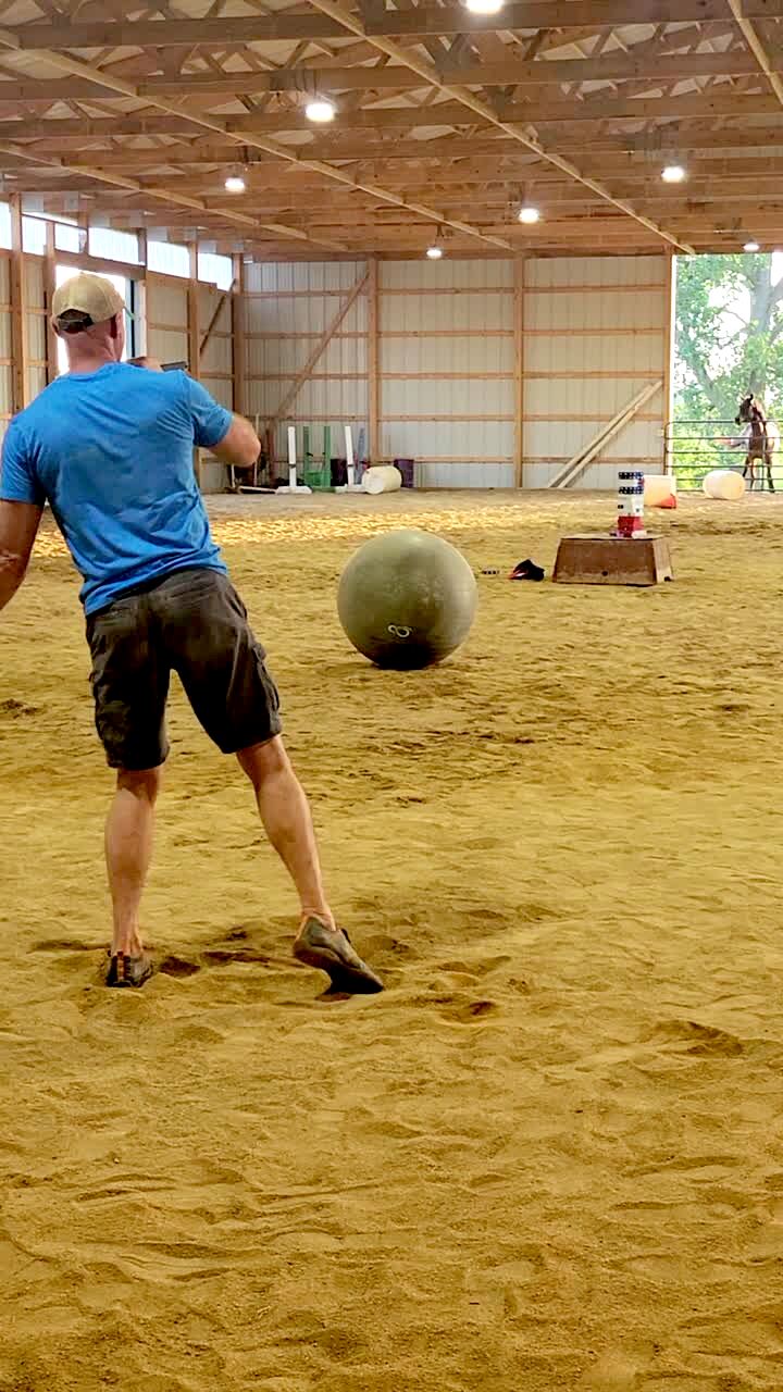 A Boston Terrier dog stands on his back legs and uses its front paws to dance with a yoga ball around a living room.