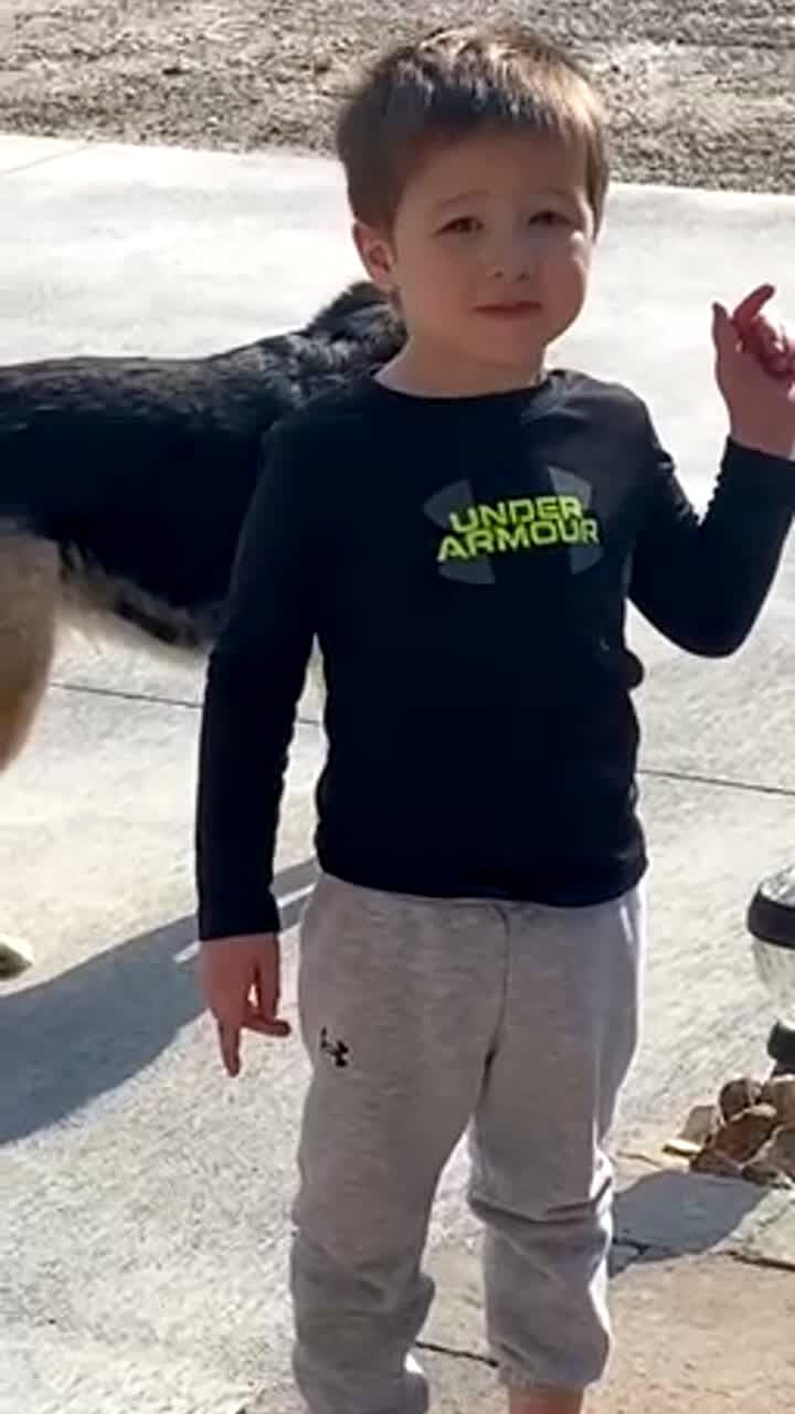 A woman films her broken glass front door while her tot son tells her he tried to hit a bee with a rock.