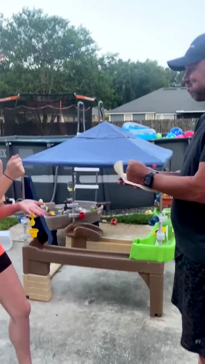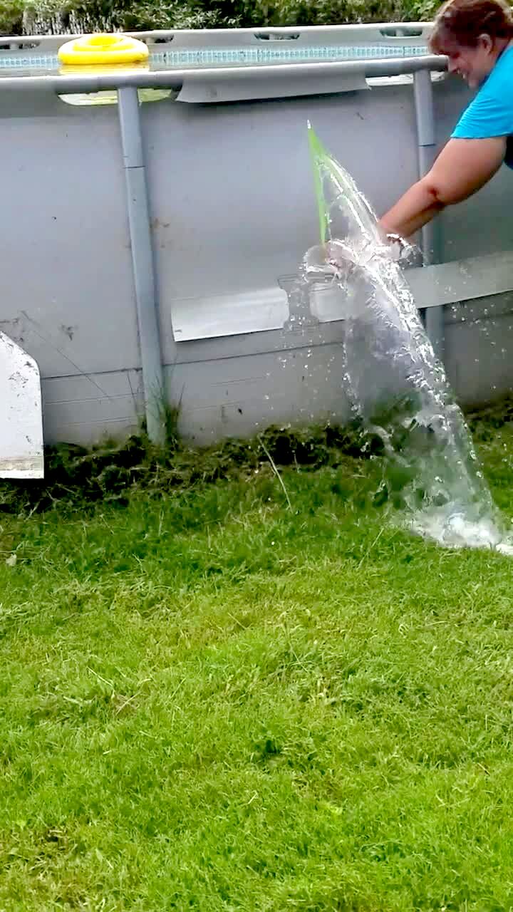 A woman uses a knife to cut the wall of an above ground pool in the yard to drain water out of it. The wall breaks open and she gets knocked down as water floods out.