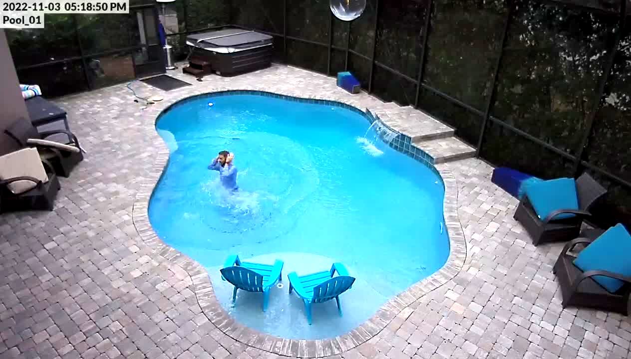 Security footage of a man talking on his phone as he steps too close to edge of the pool and falls in with clothes on.
