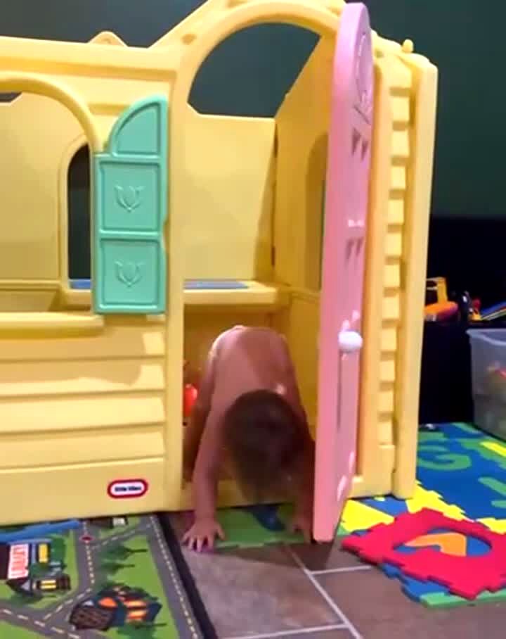 "Playhouse Player" A tot boy is in a play house. He shuts and opens the door several times. Every time he opens the door he falls over.
