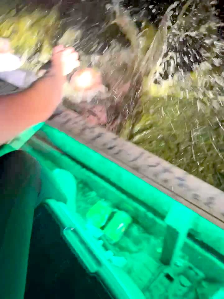 A young boy on his first frogging trip leans over too far in a fishing boat and falls into the water in a pond.