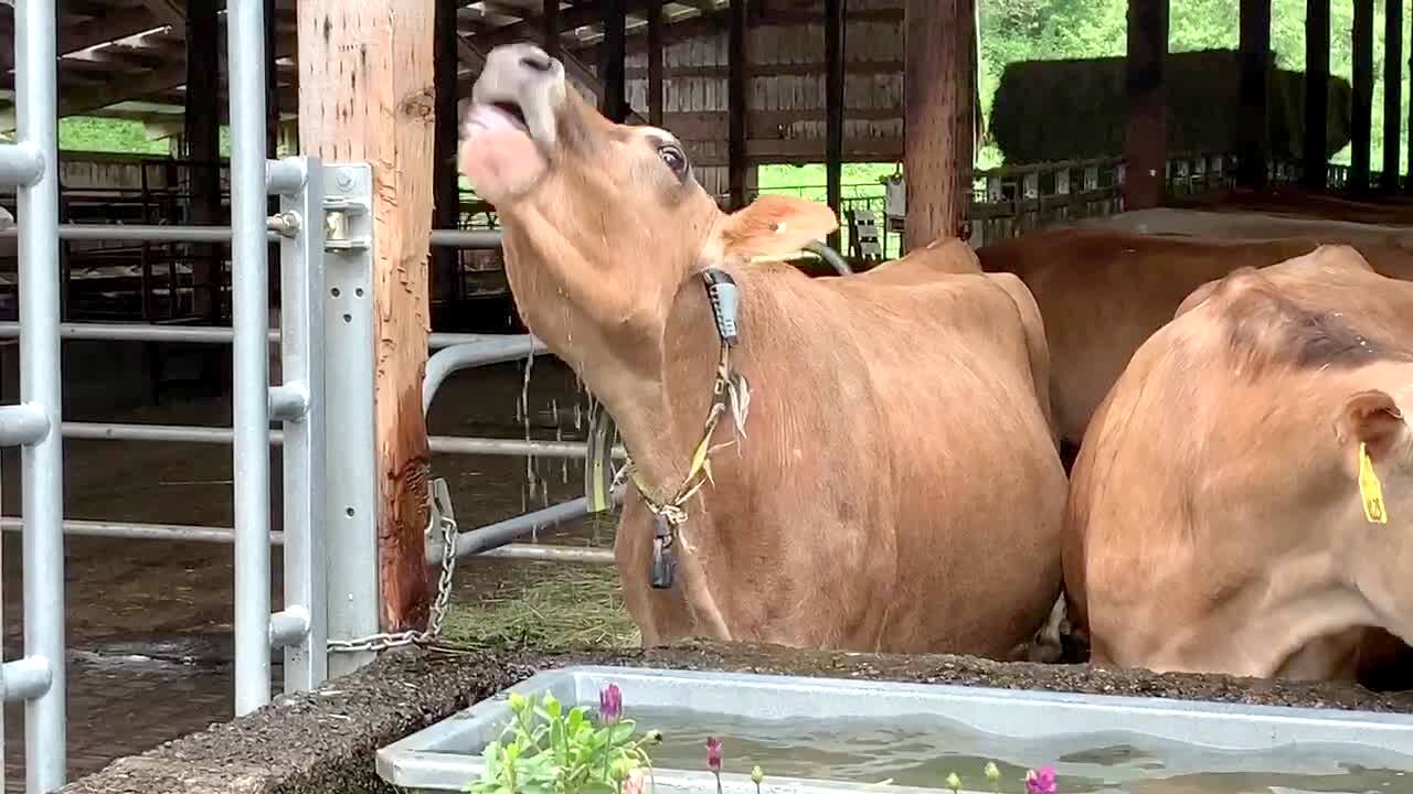 A cow plays in a water tank as she drinks from it, then makes croak sounds on a farm.