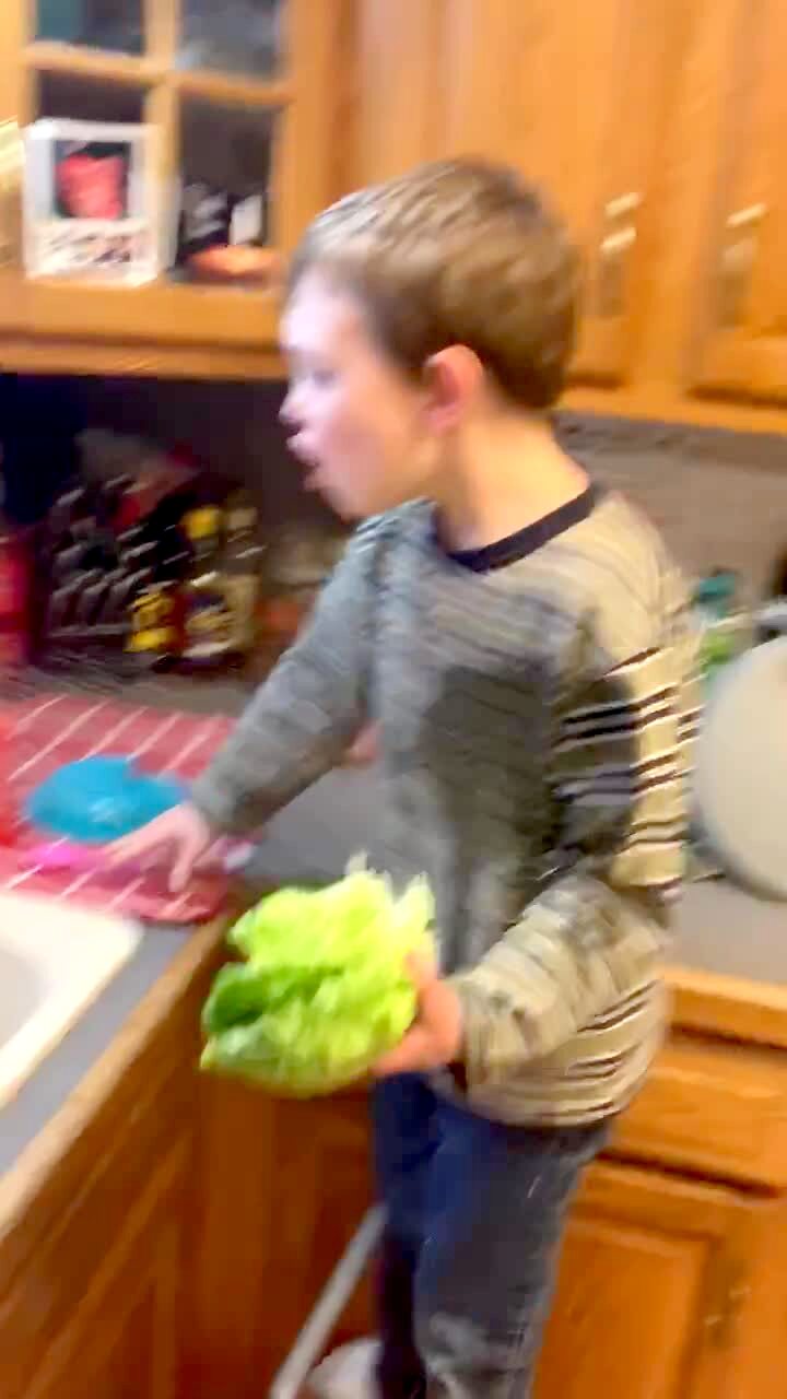 A young boy gets wet from the sink sprayer prank then whines and cries as he runs out of the kitchen.
