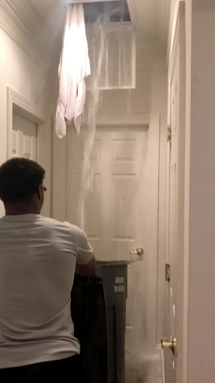 A man holds a trash can as water shoots out of an attic door in the ceiling of a house and floods the floor.
