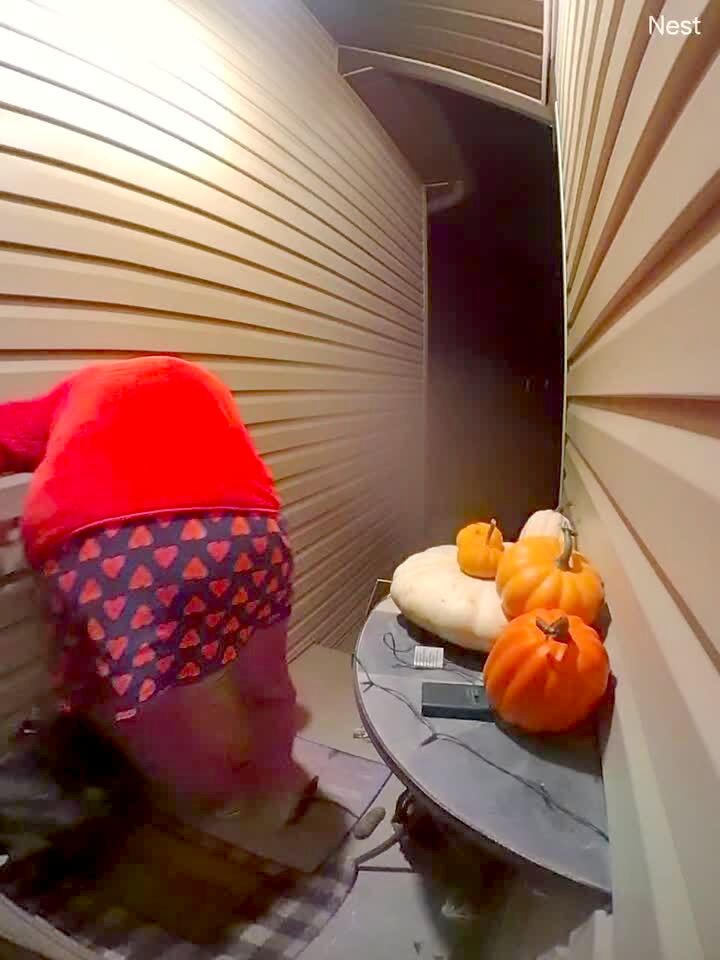 A woman walks a dog up to the front of her house, then she swears and spins around, and a bird flies out of her hair. Security footage.