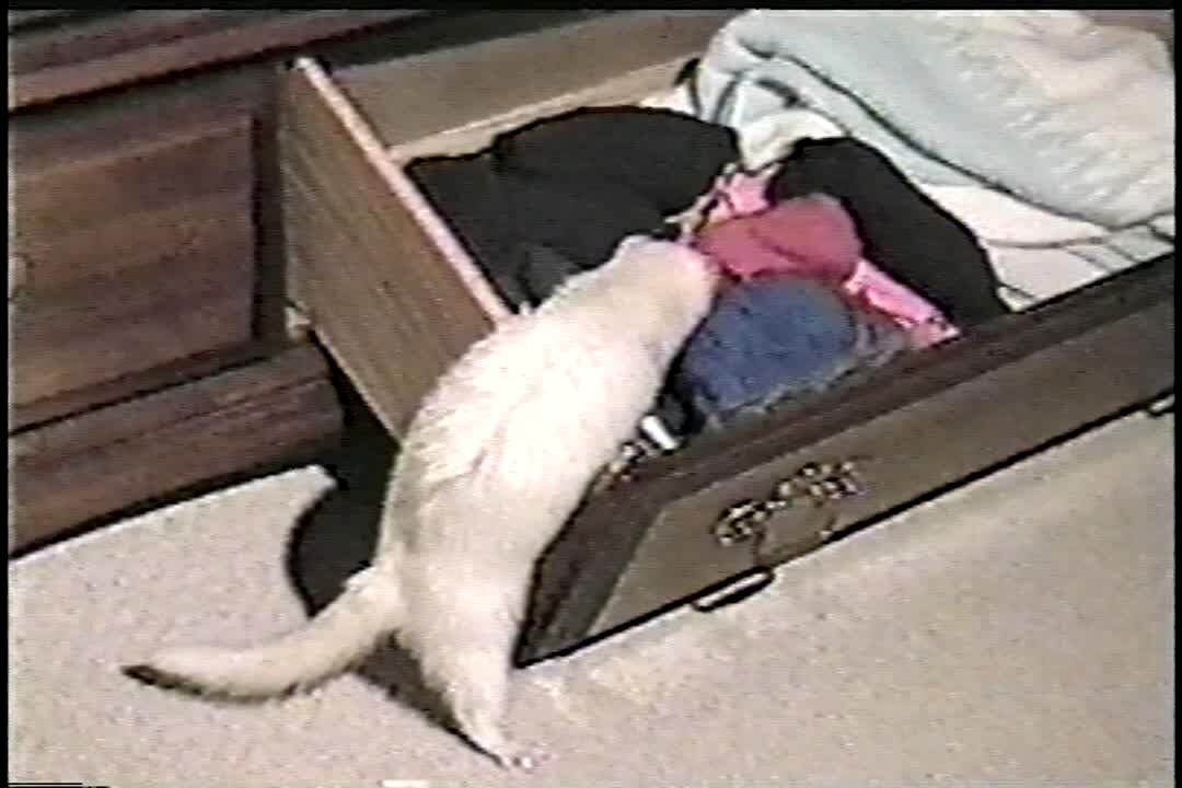 Ferrets taking socks out of drawers and hiding them under dresser.
