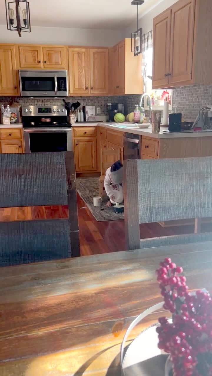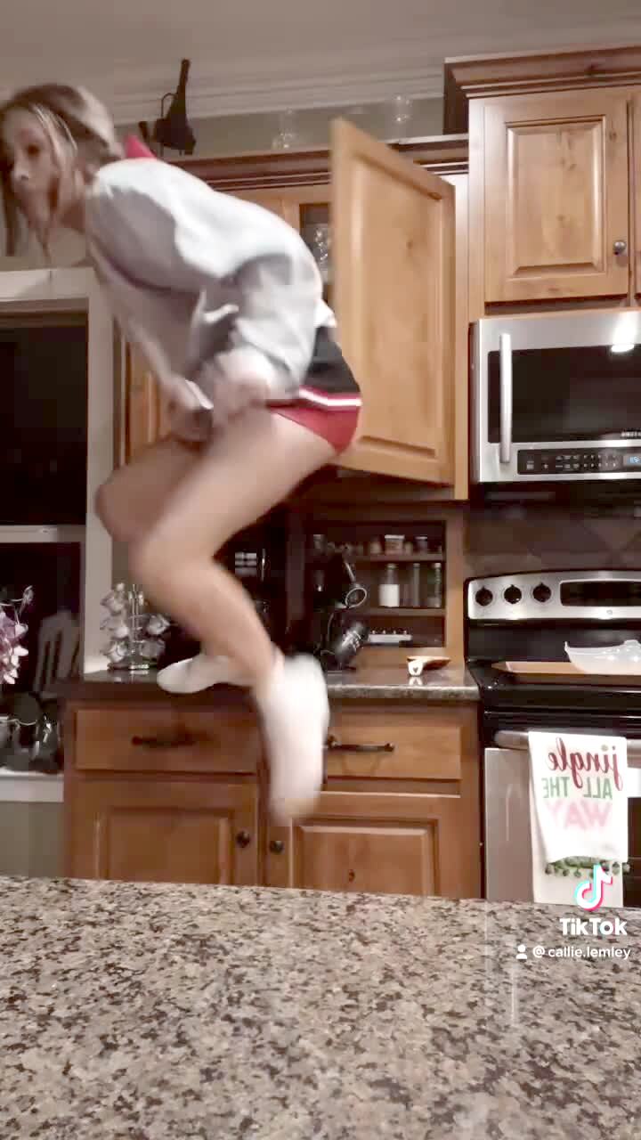 A teen girl climbs up on the kitchen counter and pretends to sing into a wooden spoon. She falls and her shorts get caught on a cabinet pull and she hangs upside down and then falls on the floor. TikTok video.