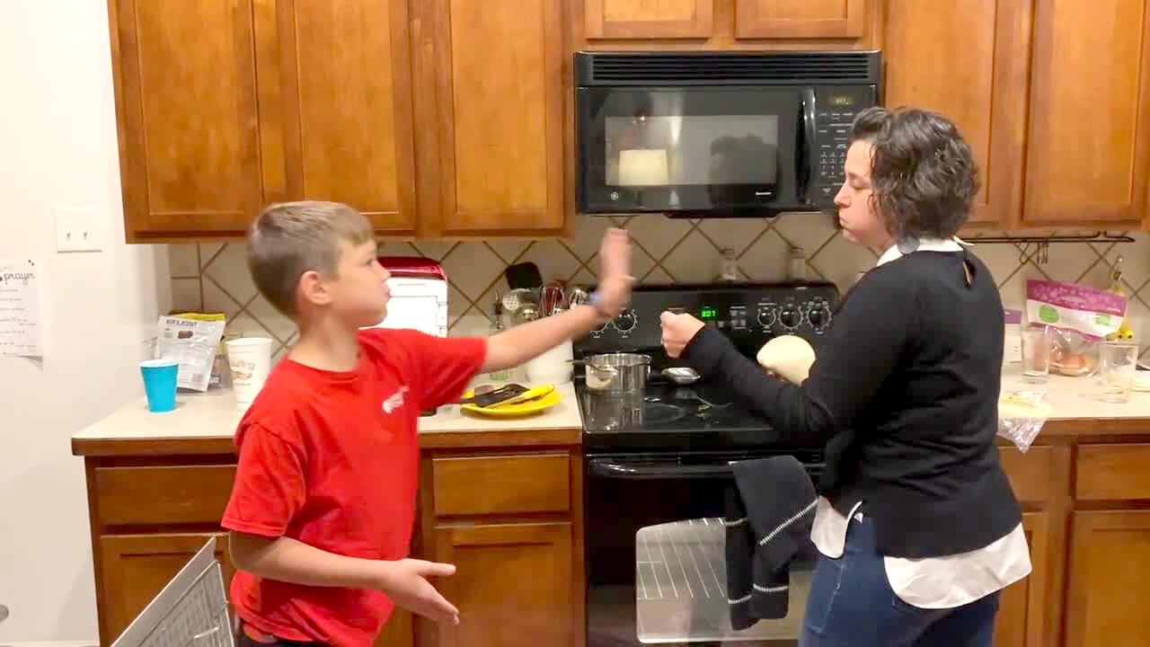 A woman and a young boy do the tortilla slap challenge in a kitchen. The woman loses "Rock Paper Scissors," then spits her water in the young boy's face before he can hit her.