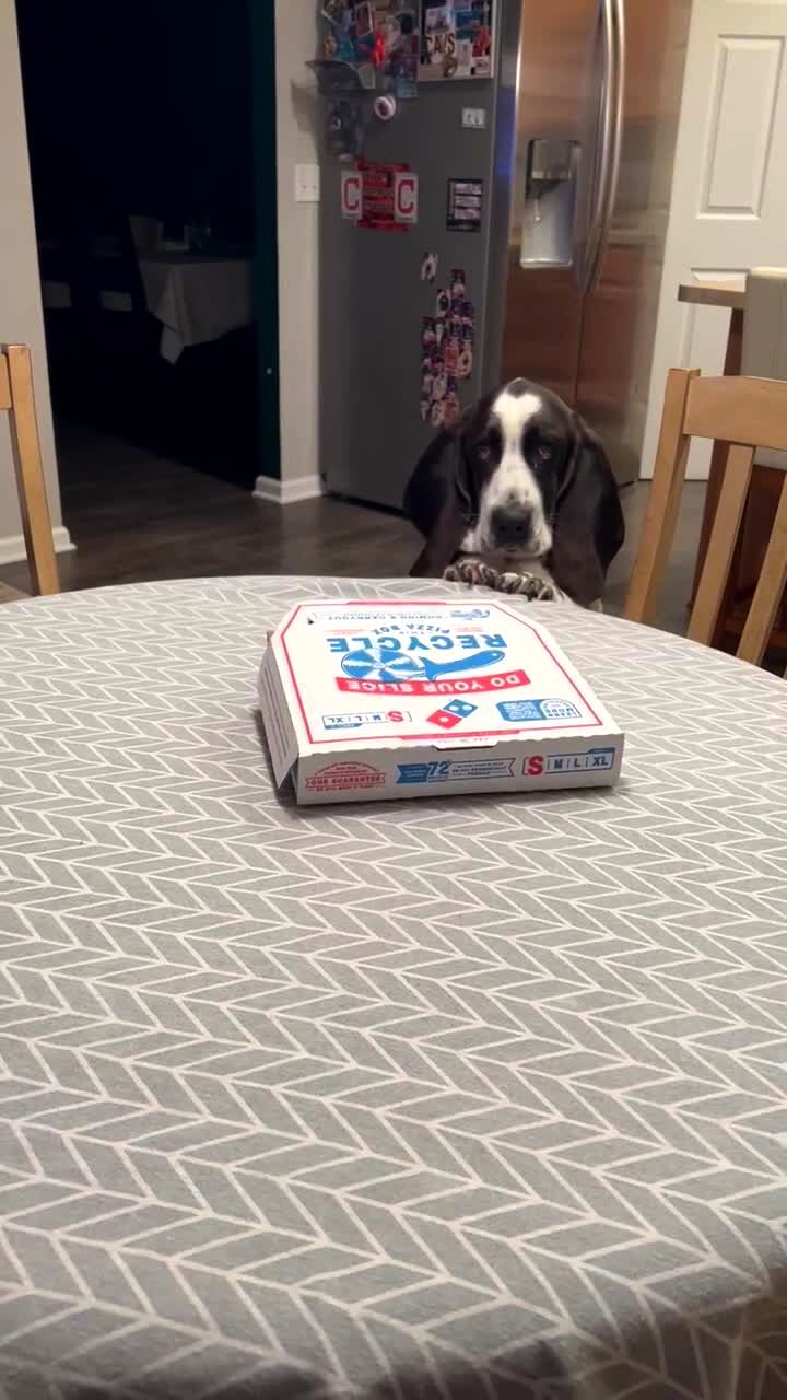 A dog pulls the kitchen tablecloth down from the table to bring a box of pizza to its mouth!