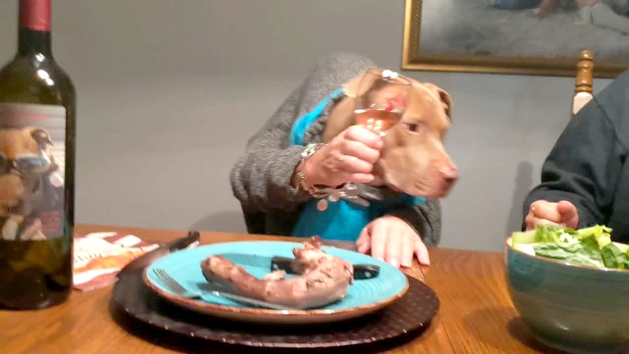 A dog with human hands sits at a dining room table while it toasts to others and eats its Thanksgiving meal. Dogs with Human Hands