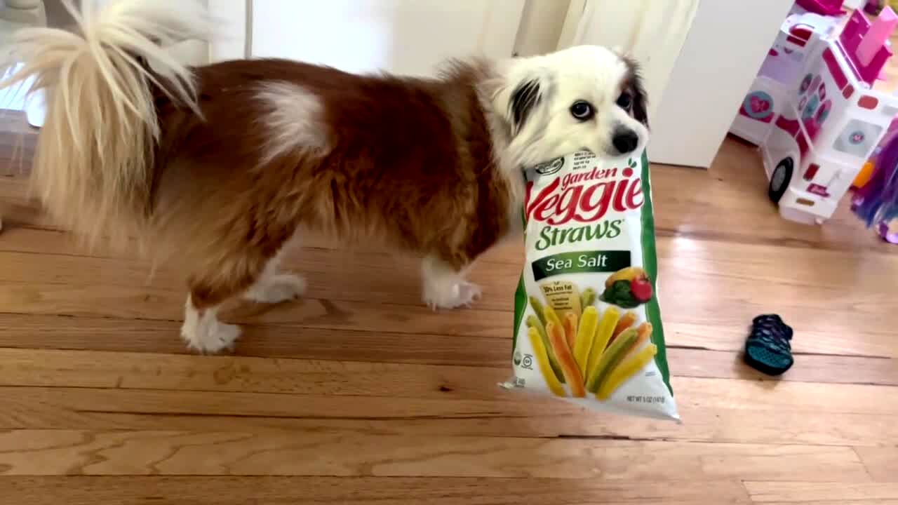 A dog stands in the hallway holding a bag of "Garden Veggie Straws" snack sticks in his mouth. A man off camera asks the dog where he is going. The dog stops to stare at the man for a moment. Then the dog slowly walks away.