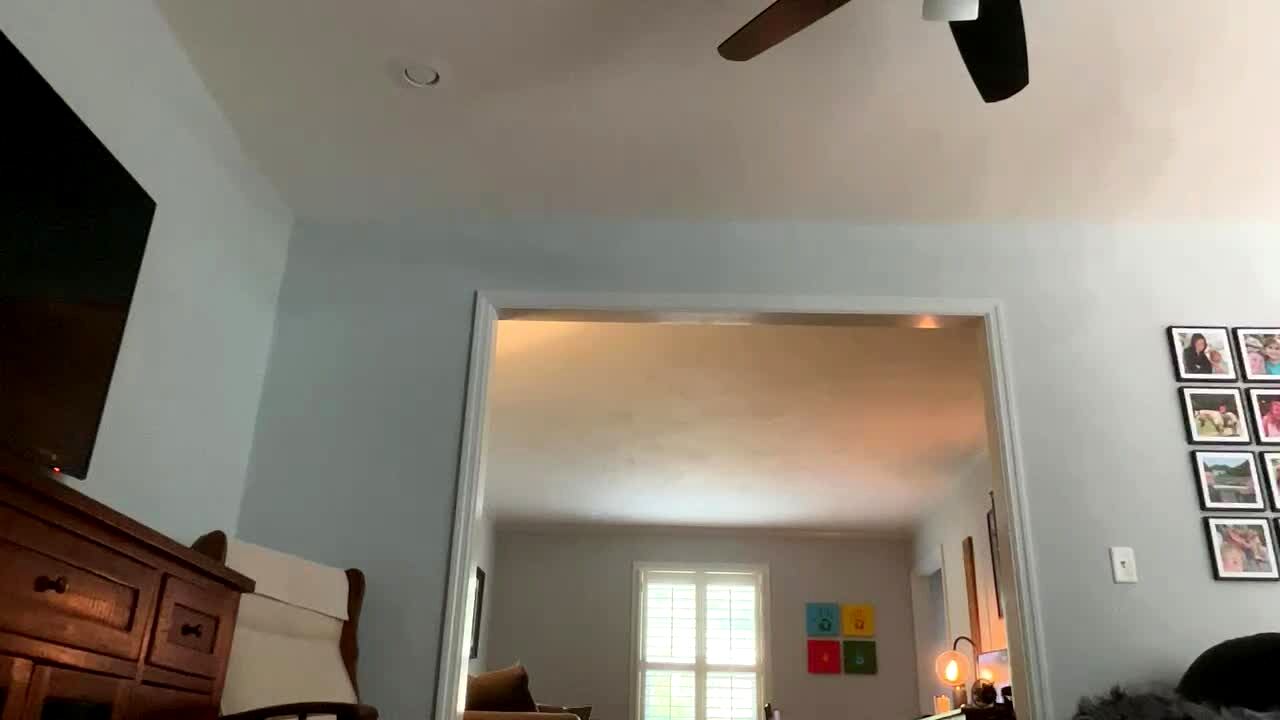 A dog smiles for the camera in the living room while a man asks her to go take a bath.