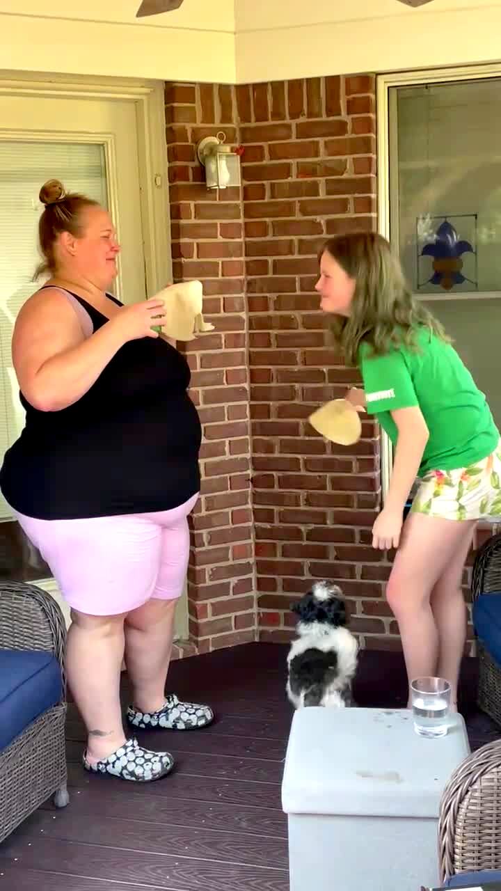 A woman and a teen girl hold water in their mouths and hit each other with tortillas on a porch while a Shih Tzu dog watches them and jumps up and down. Then the dog bites the tortilla in the woman's hand.