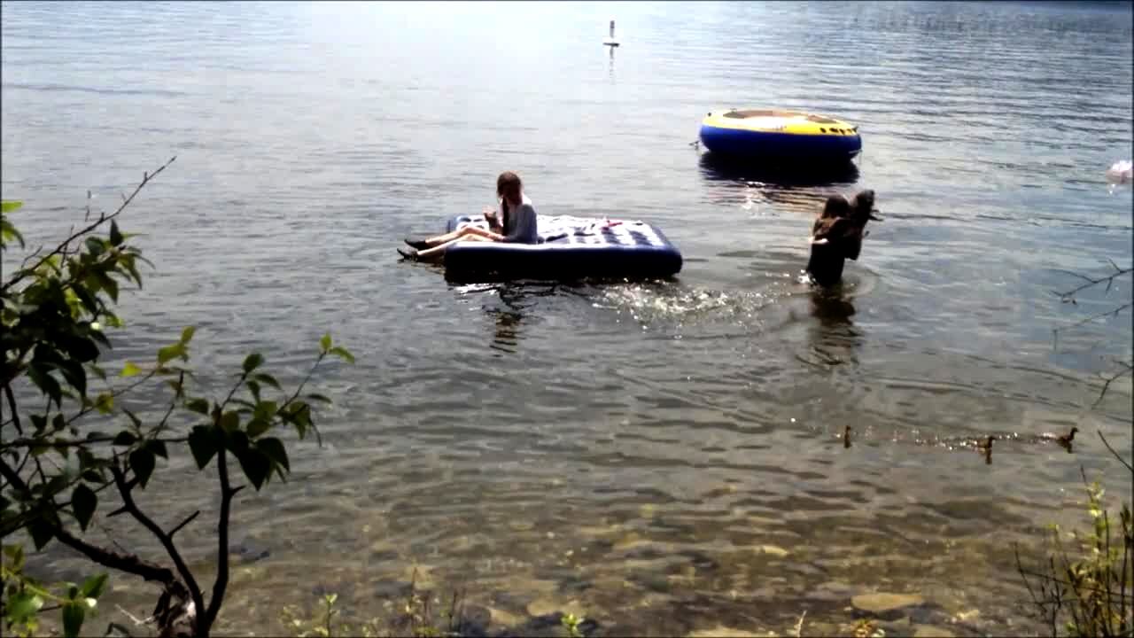 A woman tells a duck in a lake not to eat her toes and it bites her toe.