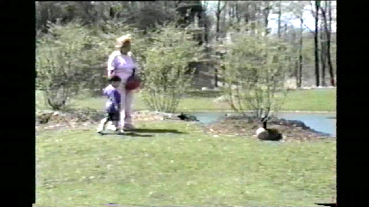 Goose - Woman & tot assaulted by duck, they both fall over backwards