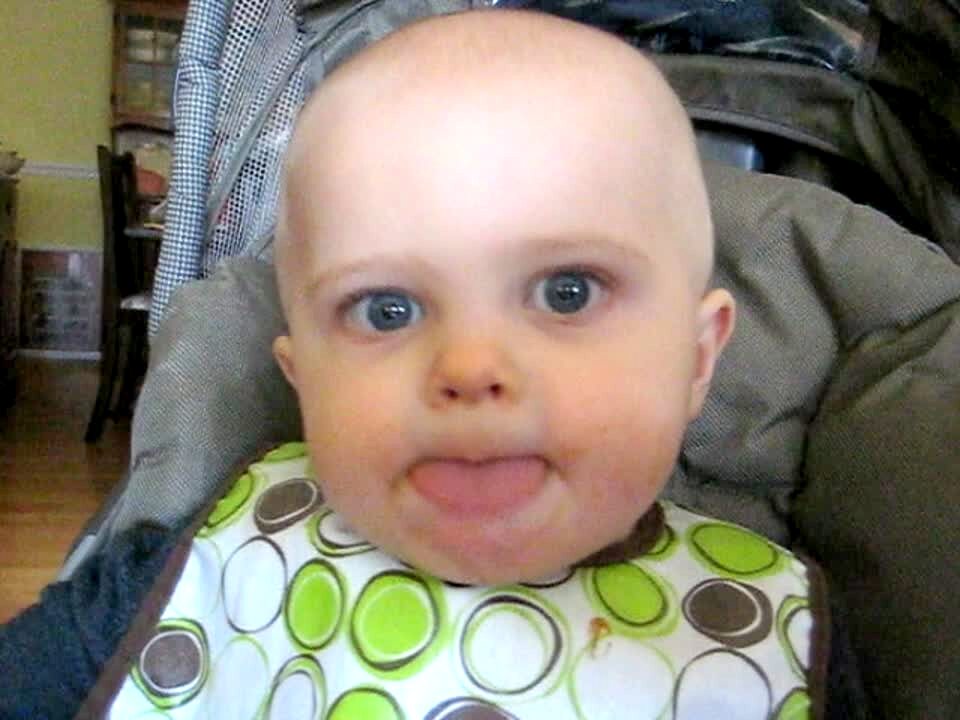 Baby boy sticks his tongue out and makes a silly face while sitting in his high chair eating. Baby has a blank look.