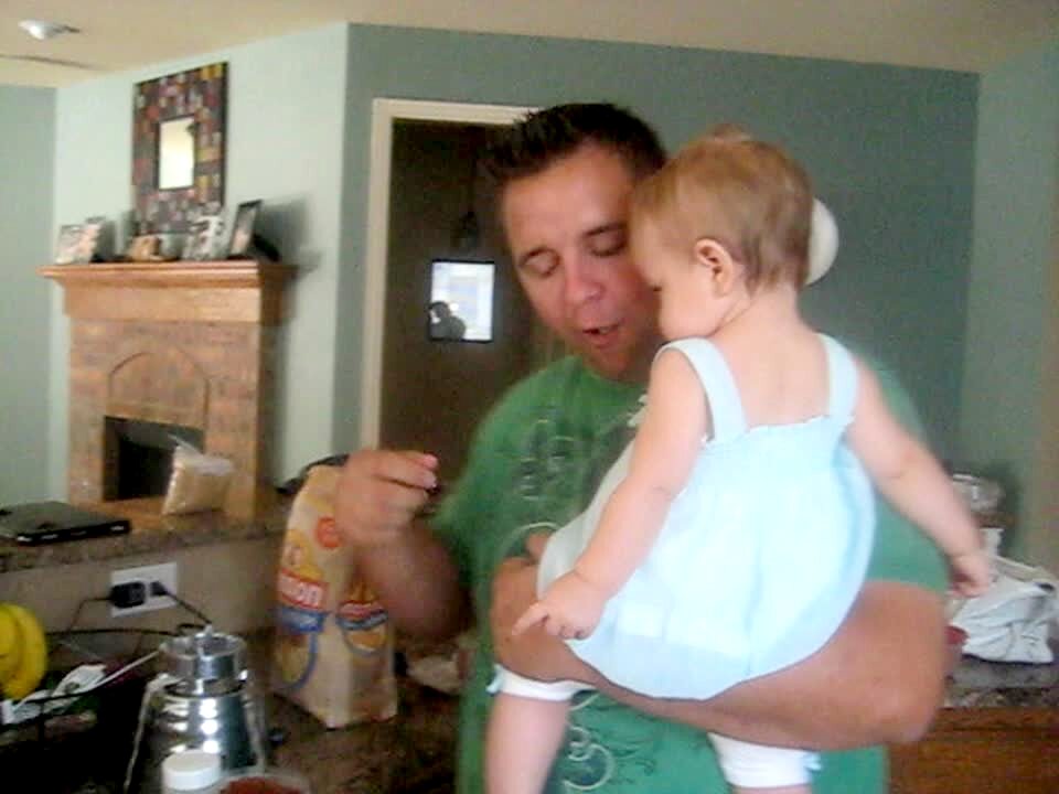 A man holds a baby girl and eats tortilla chips. Every time he's about to eat a chip, the girl bites at the chip. Cute.