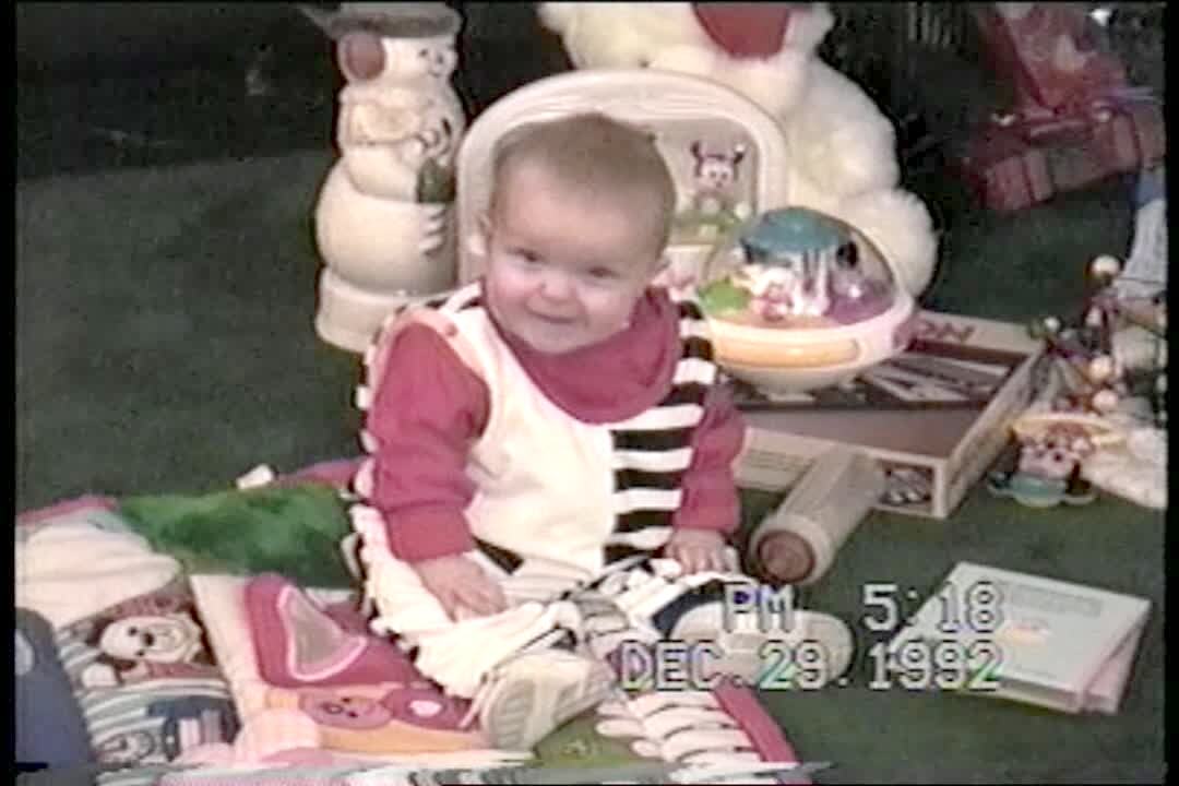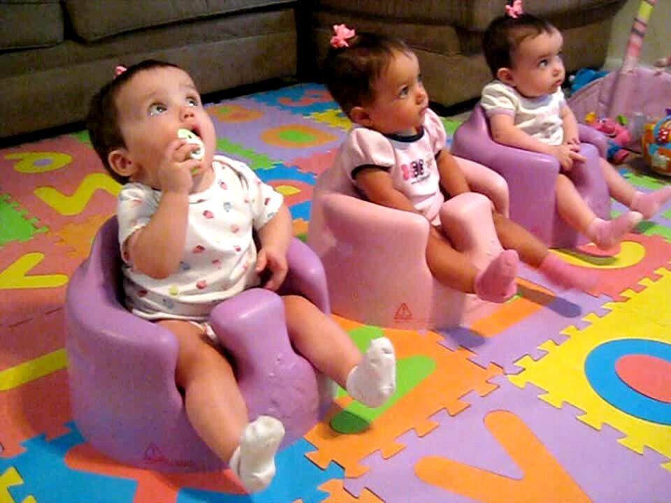Triplet baby girls sit in matching outfits and matching pink chairs watching a movie in a play room. The person behind the camera pans across the babies and lands on one with wide eyes and a funny expression.