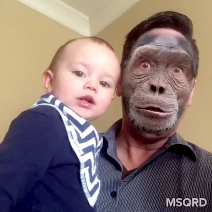 A baby boy's face is swapped with a monkey face before his dad puts the monkey face on himself and the baby waves to the monkey.