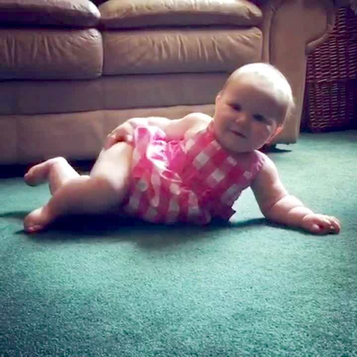A baby girl crawls on the floor in the living room indoors and positions herself on her side in a way that models do. She loses balance and falls over. Vine/Instagram