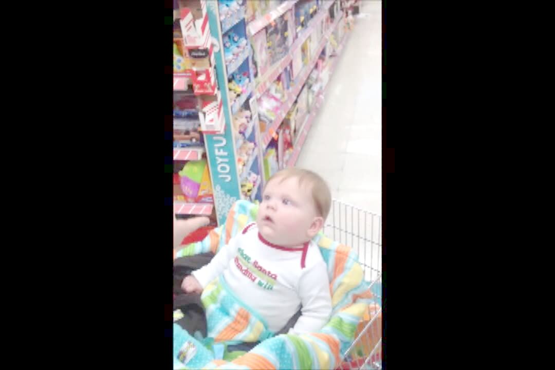 A woman wears a musical Santa hat in a store. The camera pans from her to her baby boy who is watching her from the shopping cart. His pacifier falls out of his mouth as he stares at her. Good reaction shot.