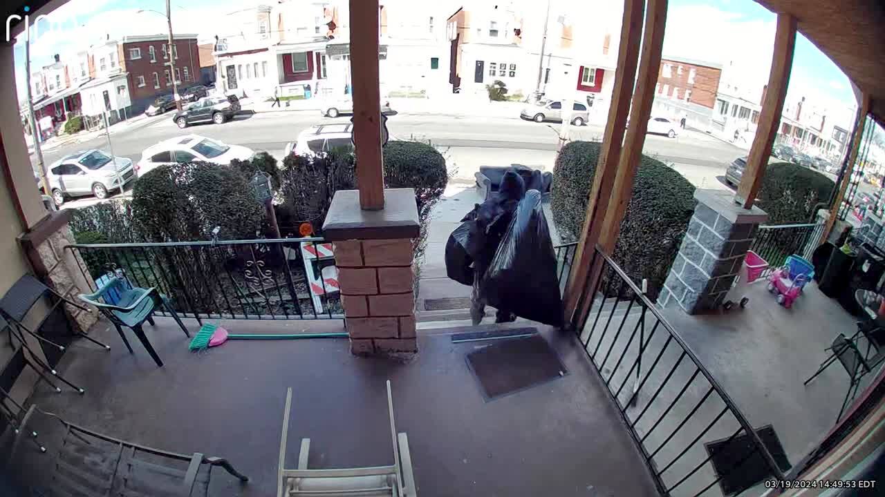 A man attempts to carry three garbage bags down front porch steps, when he topples forward onto the sidewalk instead. Security footage. Featured talent cleared (man carrying the trash bags).