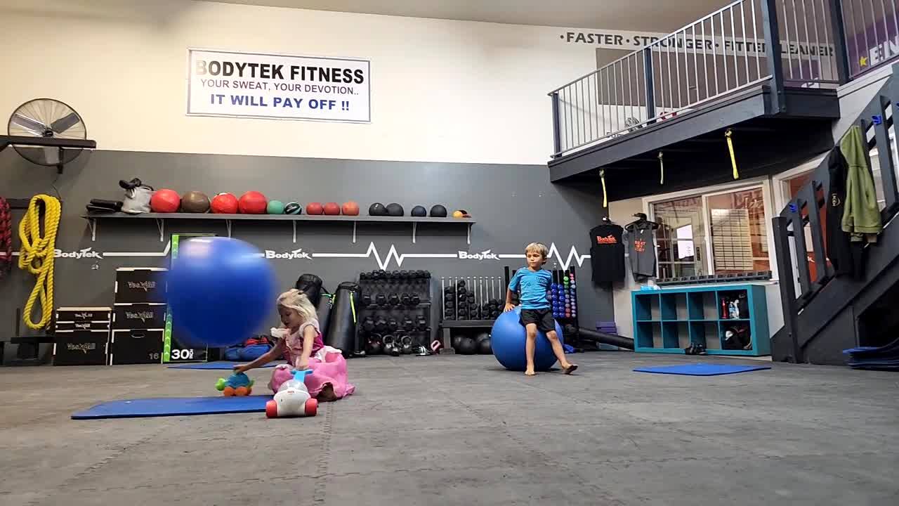 A young girl swings from a bar and tries to jump onto a large yoga ball but bounces off of it and falls to the floor.