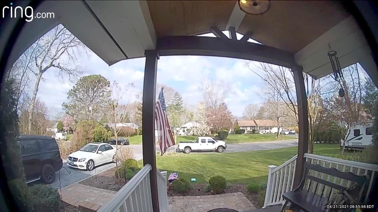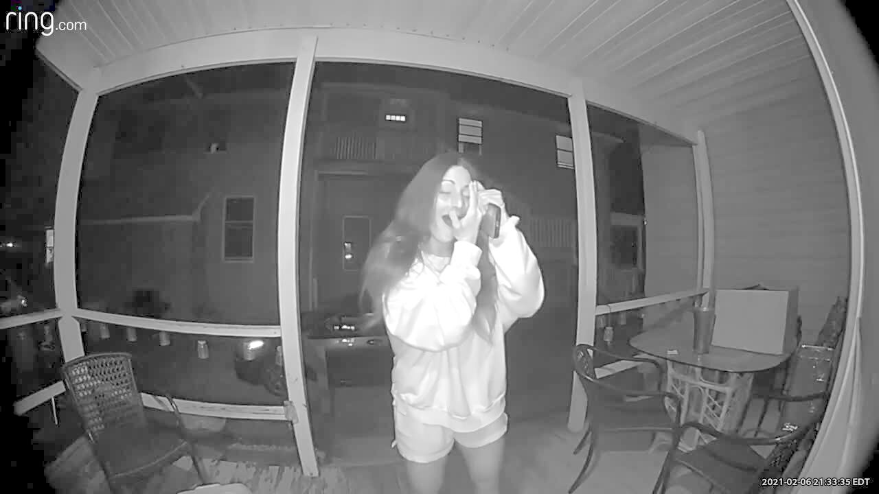 A teen girl talks through a doorbell camera on a porch, then a screen door swings open and hits her in the face. Security footage.