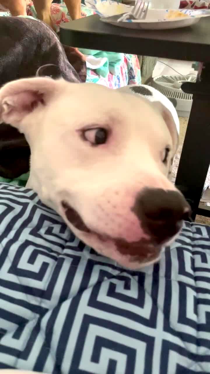 A man says "got your nose" to a pit bull dog in a kitchen, and the dog barks at him, but then she stops barking when the man says that he gave the nose back.