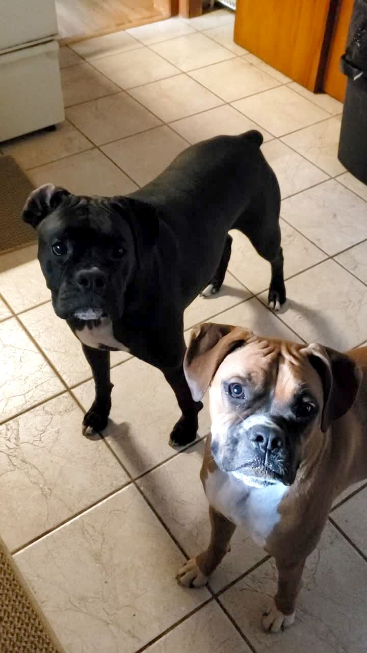 Two boxer dogs in a kitchen lick their lips every time they hear a dog toy squeak.