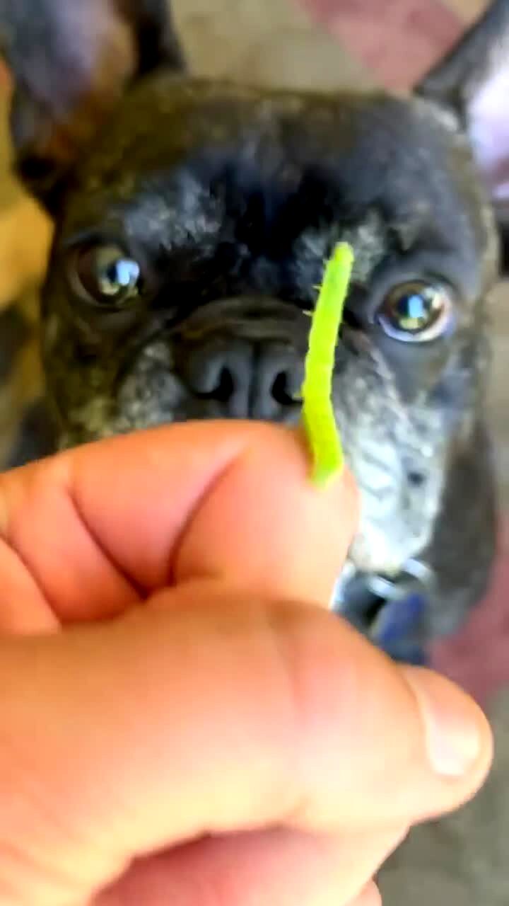 A dog stares at a caterpillar that someone holds in front of him. Then the dog bites the caterpillar to eat it.