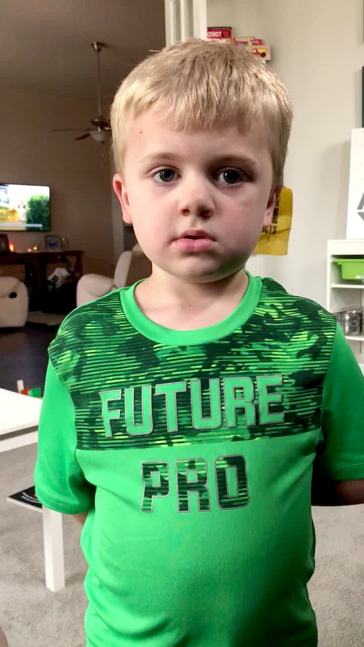A young boy holds a yellow flag behind his back in the living room while he lies to his mother that he left it outside.