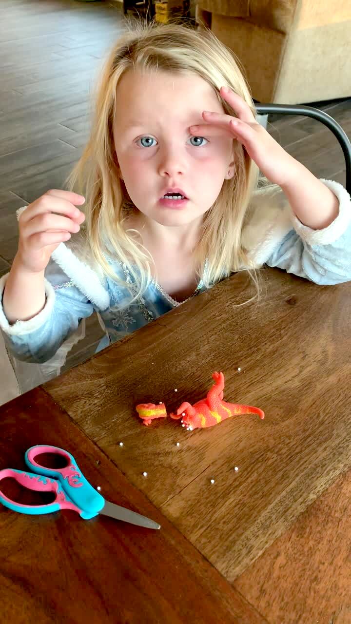"She Wrecks the T-Rex" A young girl sits next to a broken dinosaur toy and says that the toy just broke and she didn't do it. The mom says that the scissors just happened to be there and asks the girl if she cut off the dinosaurs head. The girl says no and that the toy just broke.