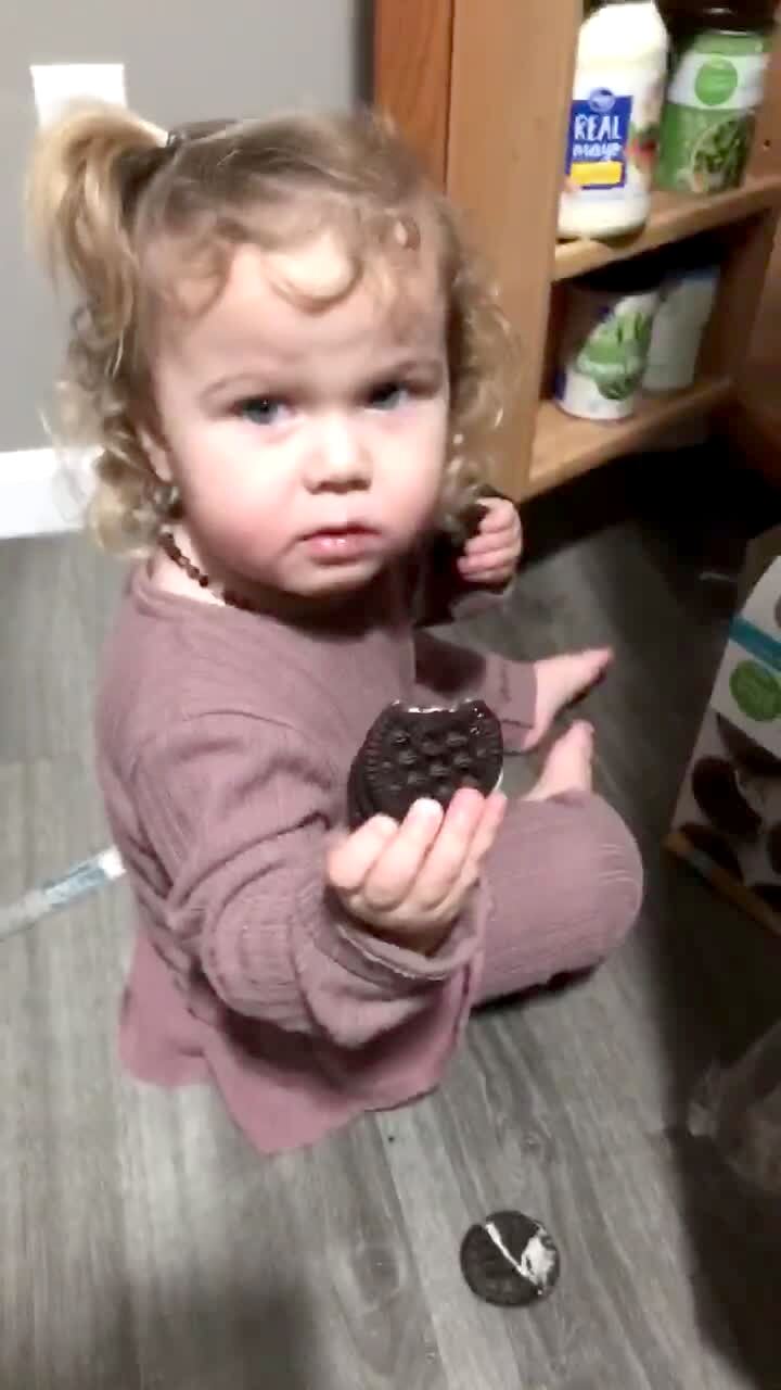 A woman asks a tot girl what she eats. She holds up a cookie and says "apple" in a kitchen.