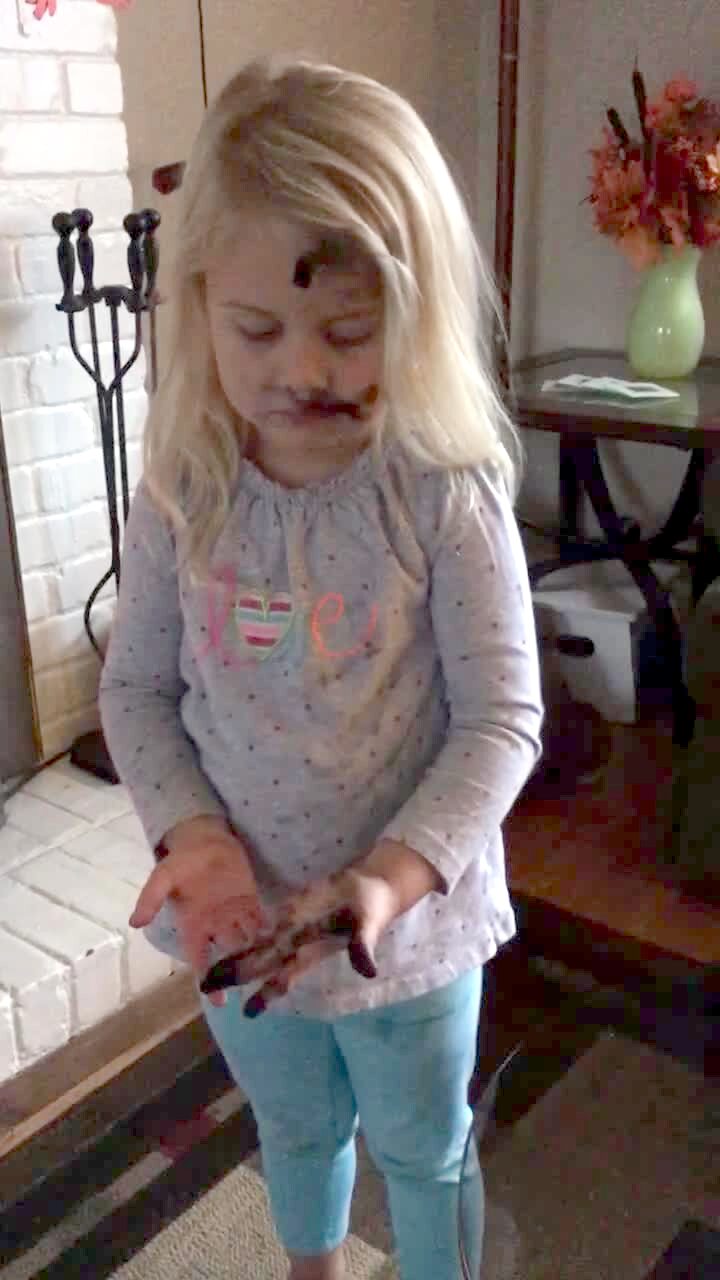 A woman asks his tot daughter if she touched the fireplace and she says no, but has soot all over her face and hands and finally admits to it.