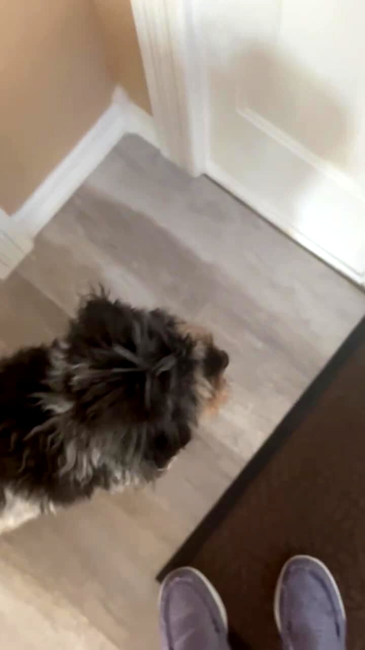 A woman calls to a small dog who stands quietly near the front door to the house. She opens the door, and he runs out into the yard to aggressively shake a package on the doorstep.