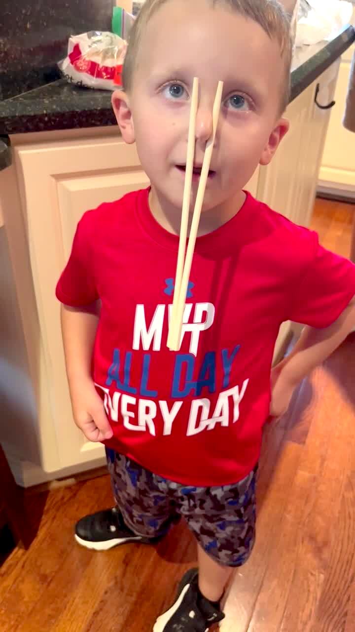 A young boy puts unseparated chop sticks to pinch his nose so that he doesn't have to "smell any farts from me"