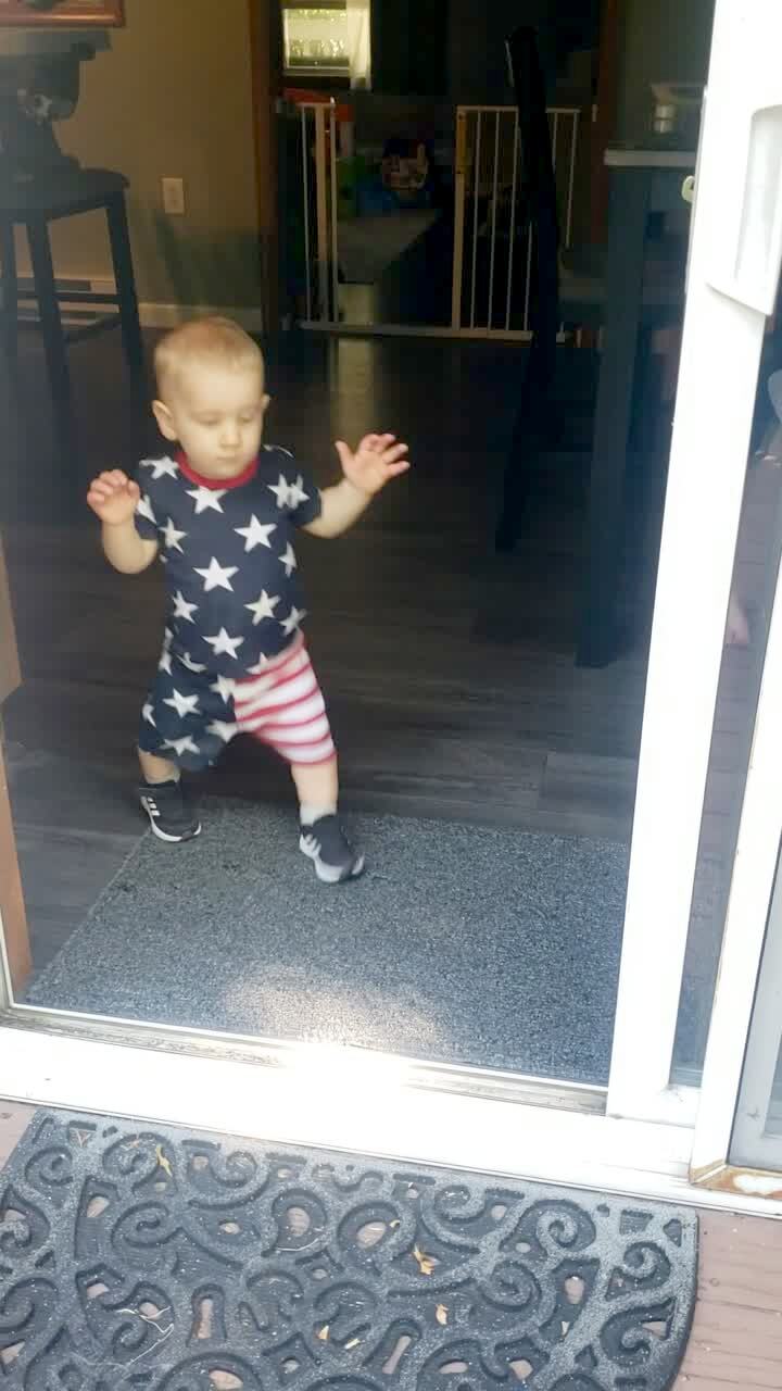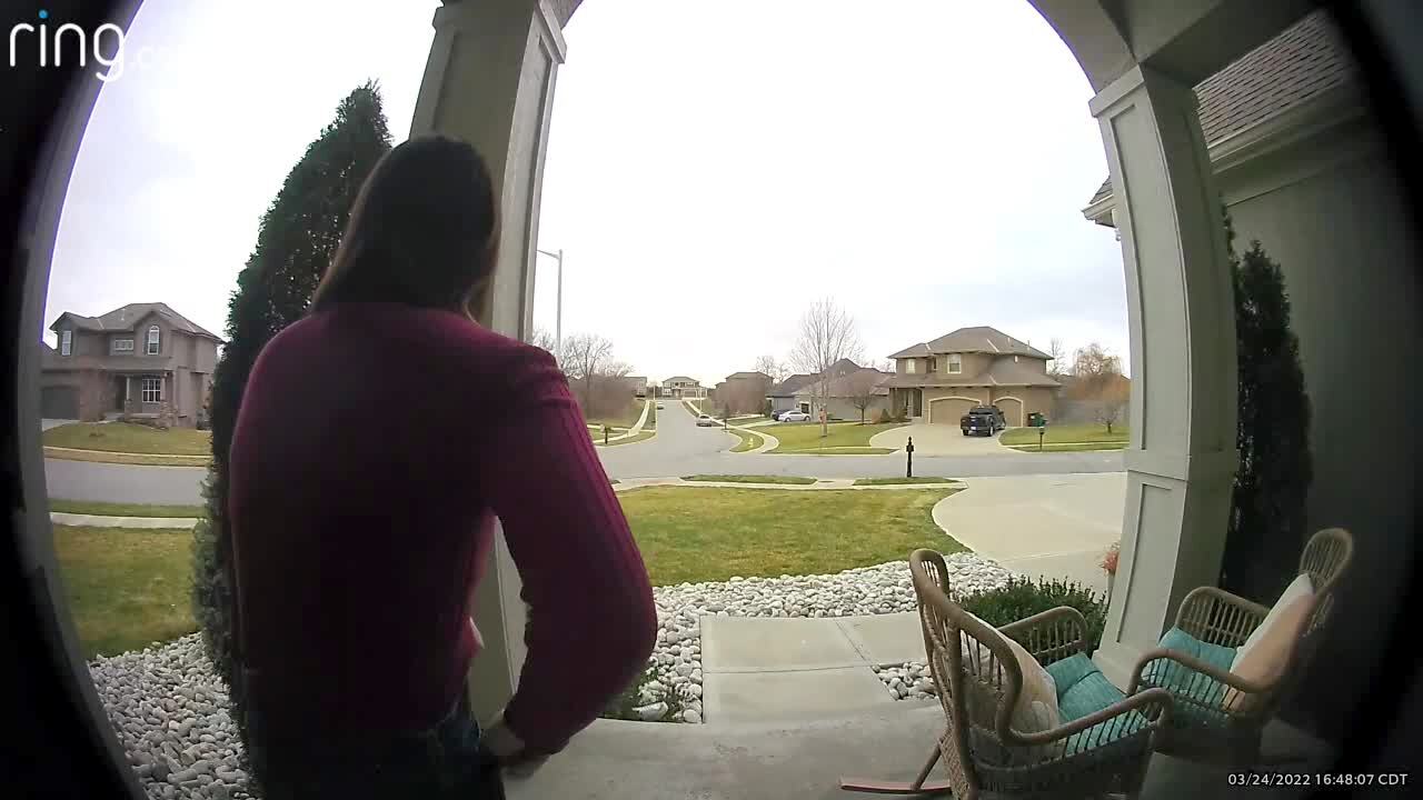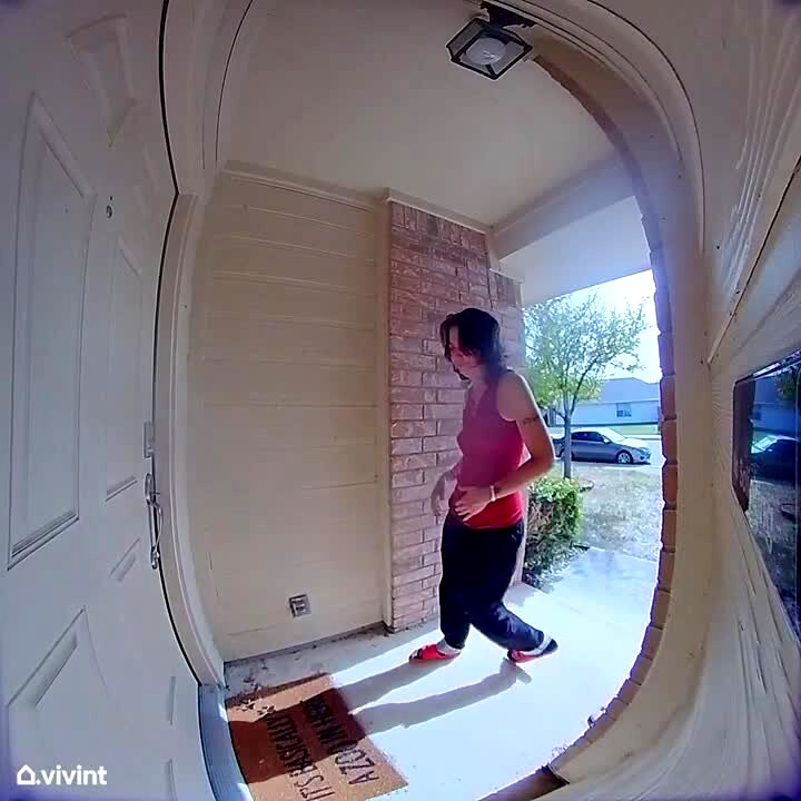 A woman steps out of a front door, farts, goes to re-enter the house, but thinks again, goes back outside, farts again, then re-enters the house. Security camera footage.