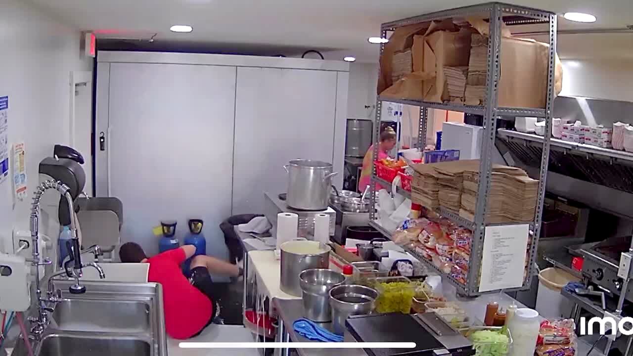 A young man takes a pot of hot cheese off of a stove in a restaurant kitchen and spills it. Then he slips and falls in the cheese. Security footage. Screen recording. No audio.