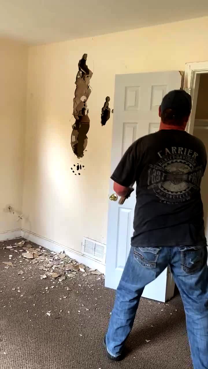 A man uses a sledgehammer to break a door off its hinges. The loose door falls into the window and breaks it. A woman laughs. Construction