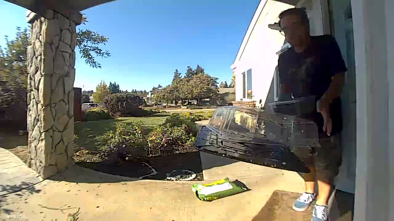 A man walks up to a house carrying a bag of chips and a large sheet cake. When he tries to open the front door, the cake box opens and the cake falls on the ground. He yells "oh my God" and drops everything he carries and goes into the house. Security footage.