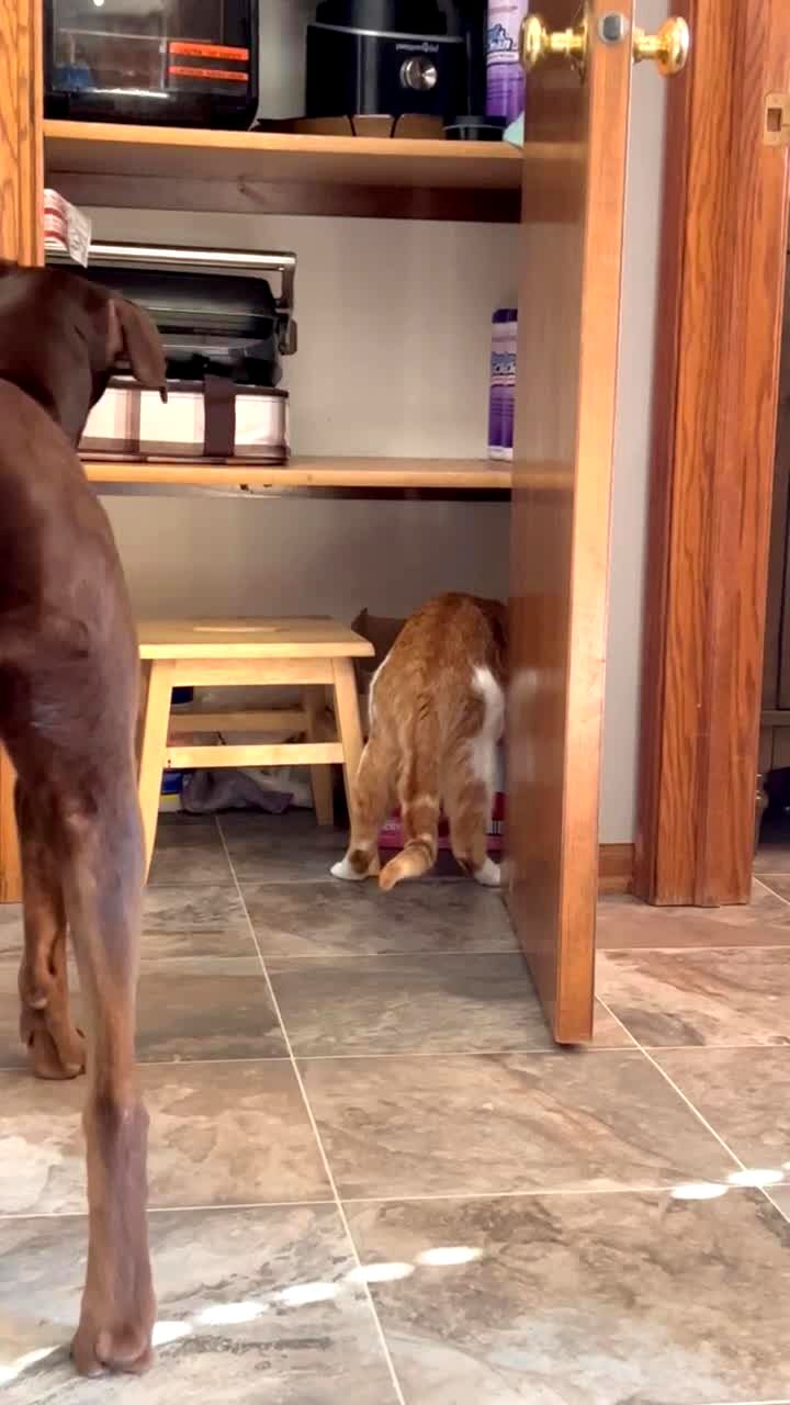 A cat takes a dog treat from the box in the kitchen. The cat drops the treat for the dog and the dog carries it away.
