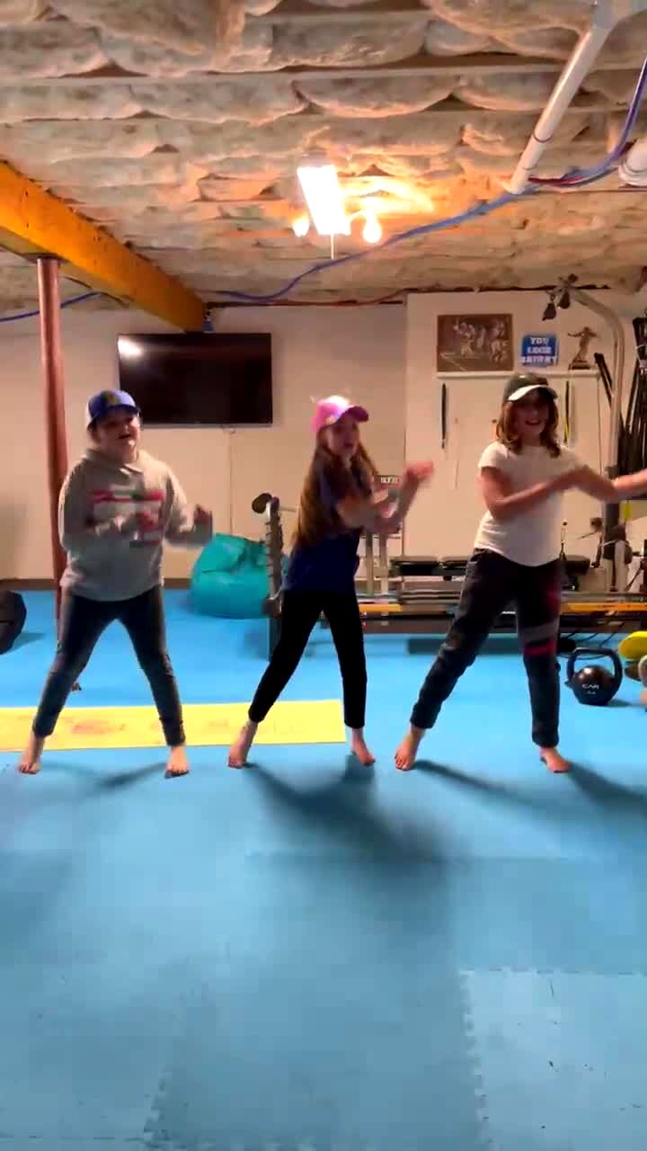 Three young girls all wear baseball caps and dance to music in a basement. One girl moves her head and makes her hat fly off. The hat ends up on the head of the girl next to her.