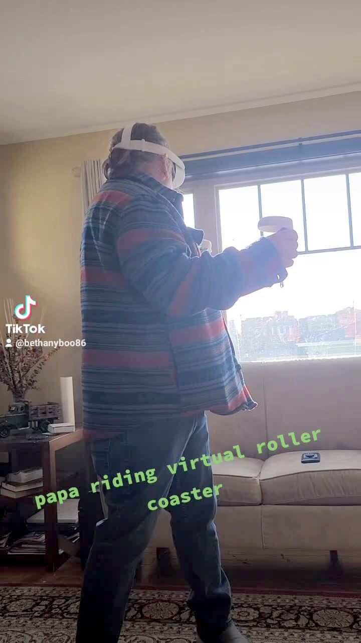 A senior man plays a rollercoaster game on a VR headset and falls backwards into a wall in a living room. TikTok.