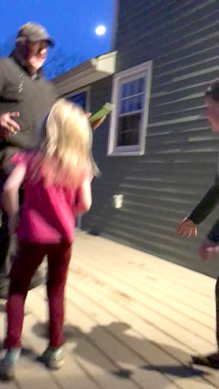 A woman stands on a porch step and tries to take a photo of a teen girl on the porch but the woman steps off the step and falls down on a bush. Security footage.
