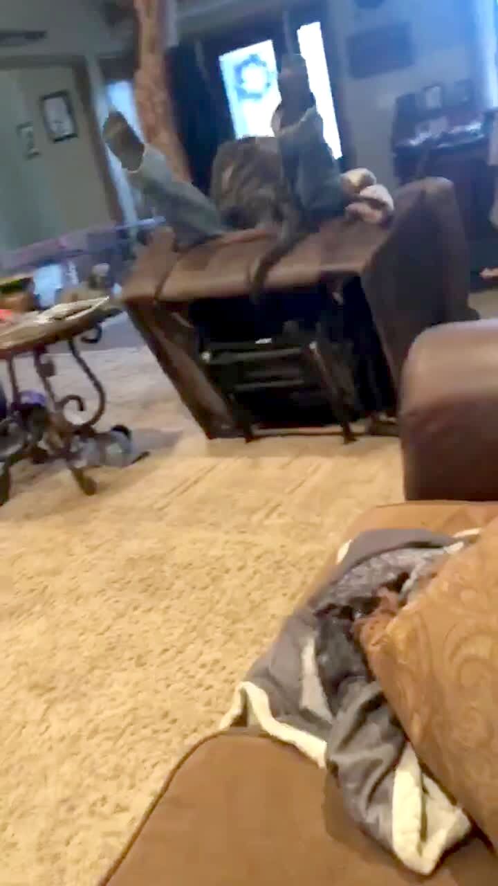A small terrier dog sleeping on a couch hears a woman gasp and bolts up, excited. Gasp at Your Dog Challenge